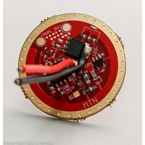 The driver is flashed with firmware customized for this build with an ultra low resistance FET that gives you near-direct-drive performance (limited mostly by your battery, LED, and connections) with the ability to still use lower power levels, and utilize a temperature sensor, among other functions. The FET levels have been tuned for a reliable low moonlight mode.